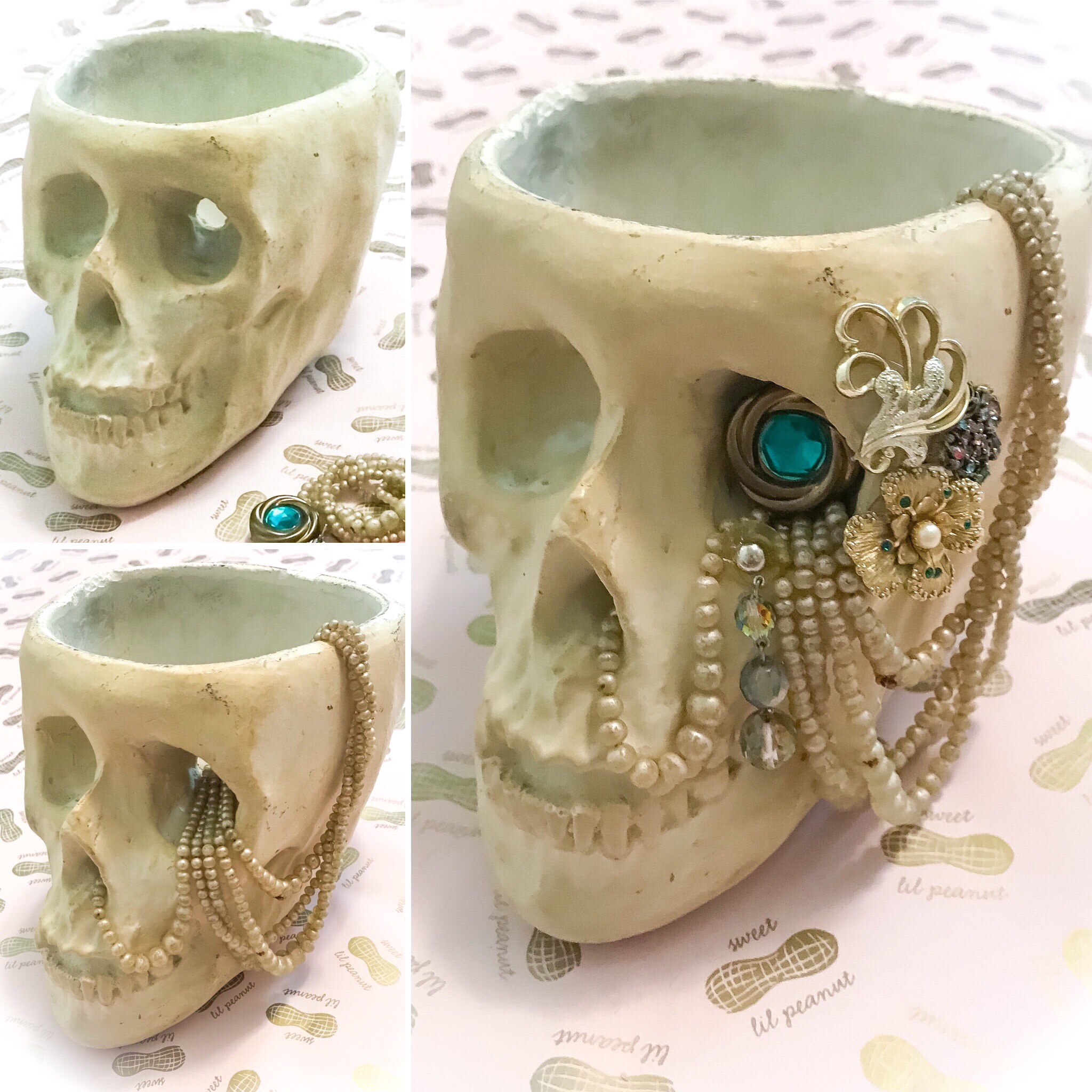 Add junk jewelry. I love my cement skull! It can be used in so many ways. This year I gave her a quick makeover. I collect junk jewelry for projects just like this. Apply a generous amount of hot glue to each piece. Don’t worry with hot glue you can remove it later if needed! Now you have a gorgeous piece you can add flowers, candy or filler inside.