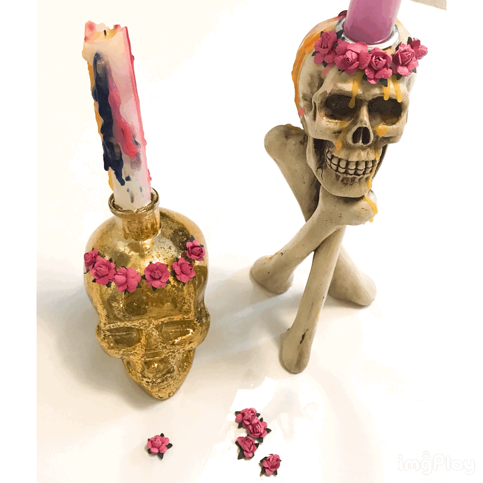 Flower Crowns are a great way to add some femme fatal to your skulls. I used small scrapbook flowers that already had adhesive on the back! Create your own with floral stems or use stretchy floral headbands for larger skulls.