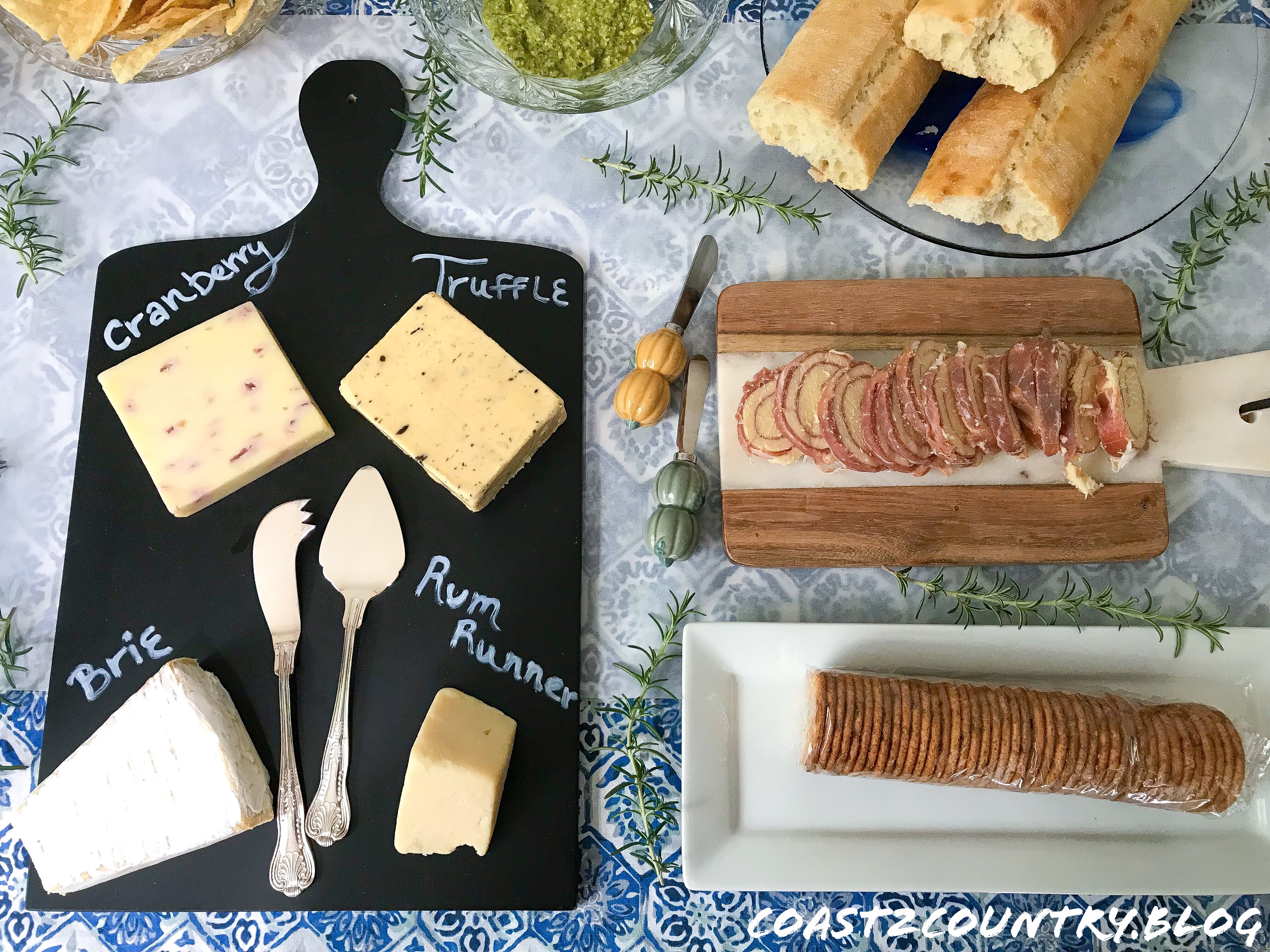 There are so many tasty seasonal cheeses! I found cranberry cheddar, truffle & rum runner. Pesto sauce and baguettes add a hearty touch.