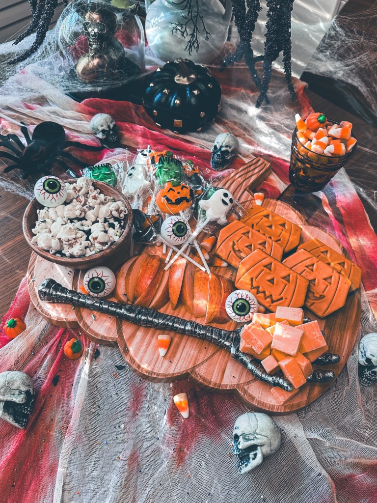 Not only is it a practical tool for prepping all your ghoulish goodies, but it also doubles as a bewitching centerpiece. I had so much fun decorating mine with eerie treats like candy corn, brownie pumpkins, creepy candy, and sprinkled popcorn—creating a display that’s both spooky and sweet!