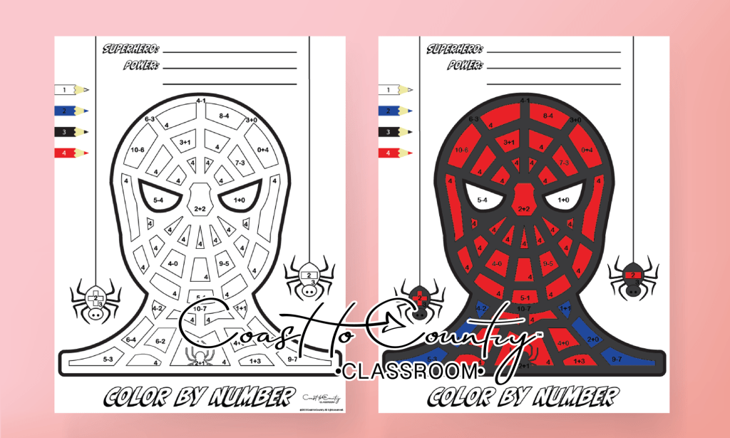 • Math Mission: Solve Spider-Man-themed addition and subtraction problems in a fun color by number worksheet! Or create your own. Example: “Green Goblin stole 4 apples, but Spidey saved 2. How many are missing?” DOWNLOAD FREE FILE AT END OF POST.