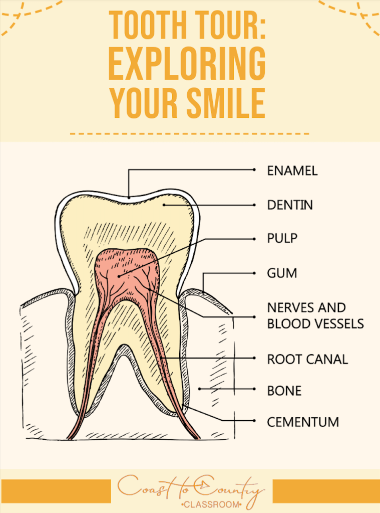 Print our Tooth Cross-Section Diagram and have kids label the parts. Use playdough or clay to build a 3D tooth model!