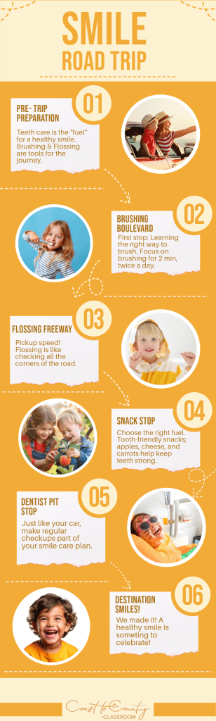 February is Children’s Dental Health Awareness Month, making it the perfect time to hit the road on a journey to a healthy smile! Just like taking care of a car for a long road trip, keeping our teeth strong and clean requires regular maintenance. So, buckle up and join us on this Smile Road Trip, where each stop along the way teaches kids how to care for their teeth in a fun, engaging way.