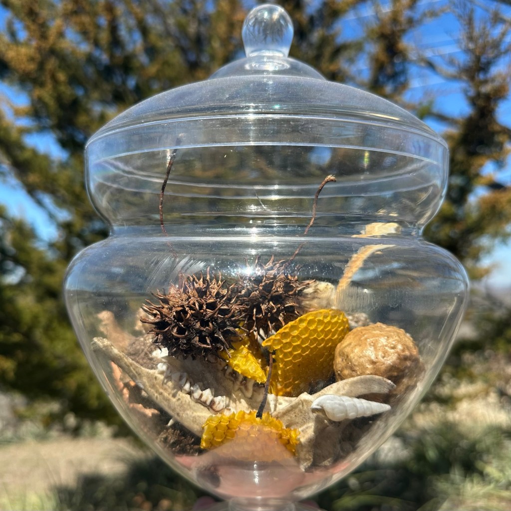 Beyond cowboy business, we had another adventure—adding to our nature collecting jar. As we walked, we scanned the ground for small treasures. Today’s finds included a fossil snail shell, a piece of a wasp nest, and a small, weathered bone. Each item became a relic of our journey, a piece of the ‘wild’ that we could bring home and examine closer.