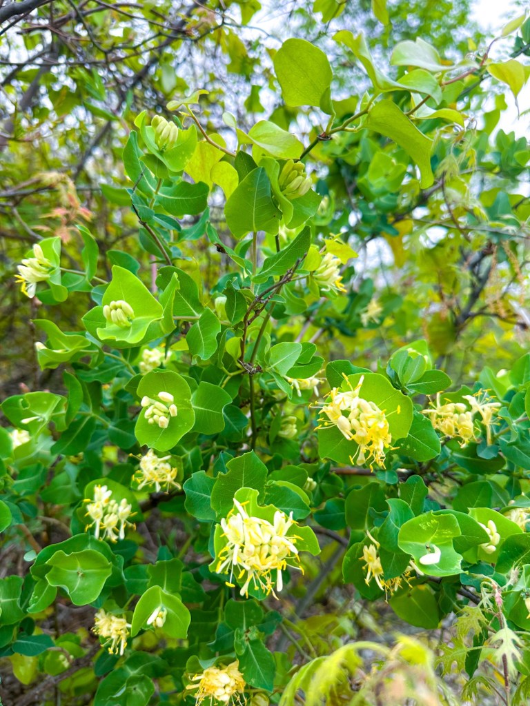 • Description: Also known as netted honeysuckle, this twining vine produces clusters of tubular, yellow-orange flowers in late spring to early summer. The blooms are fragrant and attract hummingbirds, bees, and butterflies. In late summer, it develops small, reddish-purple berries.
