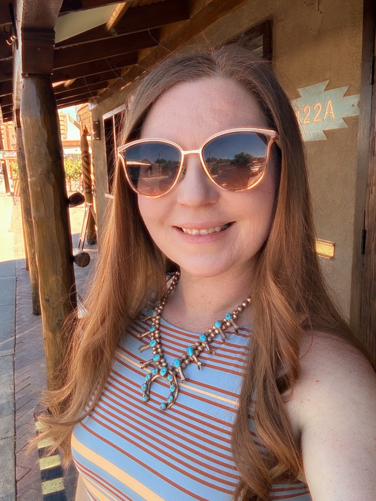 I wasn’t planning on buying jewelry (famous last words), but then we stepped into Warpath Traders. In the middle of the displays, I spotted it, a vintage Navajo squash blossom necklace, made with sterling silver and that perfect robin’s-egg-blue Sleeping Beauty turquoise. The tag said 1960s/70s, and it was stamped “R,” which likely means it was made by Richard Hoskie, a Navajo silversmith known for his clean silverwork and classic turquoise settings. The price was surprisingly fair, and the saleswoman was so warm and knowledgeable you could tell she loved what she sold. By the time I left, I felt like I’d made a friend and scored a piece of wearable art with a story.