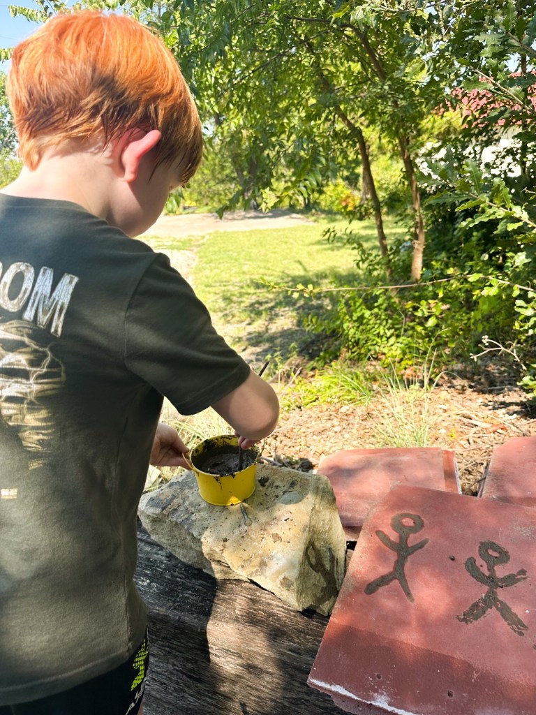 Next, we explored nature’s pantry. We gathered leaves, rocks, and seeds, studying what could be useful for food, medicine, or art. We crushed leaves and berries between stones, pretending to make remedies and pigments. With a little dirt and water, we made our own natural paint and told the story of our day with hand-drawn hieroglyphics.