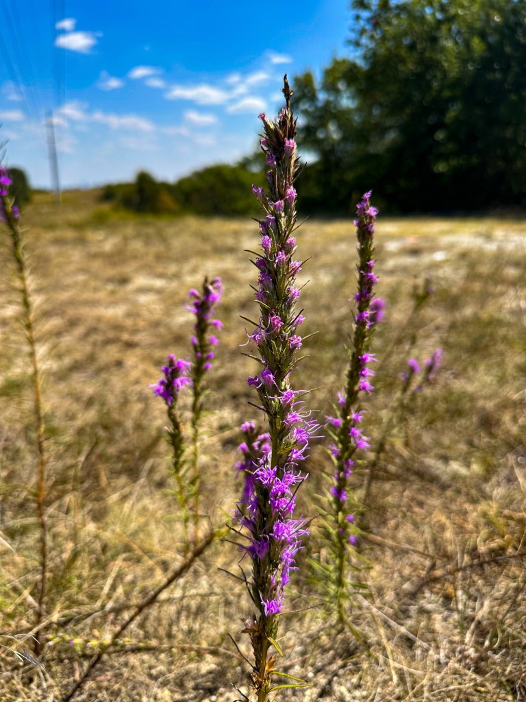 Description: A showy perennial with tall, spiky blooms in shades of purple or pink that appear in summer and fall. Its narrow, grass-like leaves and dense flower clusters create vertical interest in gardens and prairies, attracting butterflies, bees, and hummingbirds. Habitat: Thrives in sunny, well-drained soils, commonly found in prairies, open fields, and rocky slopes across Texas. Uses & Warnings: Excellent for pollinator gardens, native landscaping, and cut flower arrangements. Safe for wildlife and humans, though the stems and leaves can be slightly coarse to touch.