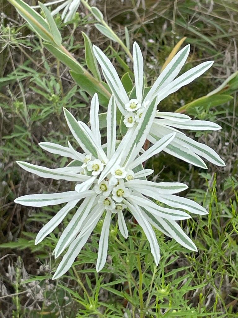 Description: A striking late-summer to fall wildflower with white, petal-like bracts edged in green, giving the illusion of freshly fallen snow scattered across Texas fields. Habitat: Thrives in prairies, pastures, and open roadsides throughout Texas. Uses & Warnings: Though undeniably beautiful, this plant contains a milky sap that can irritate skin and is toxic to livestock if consumed, so it’s best admired from a distance.
